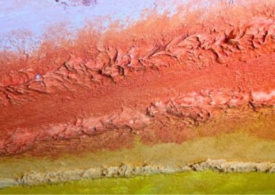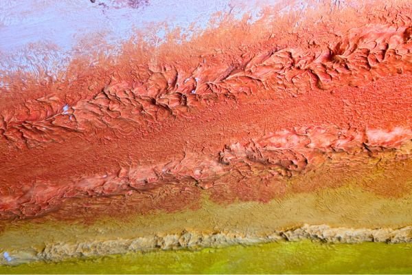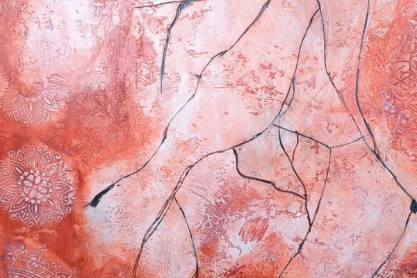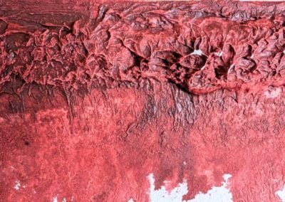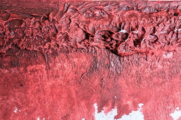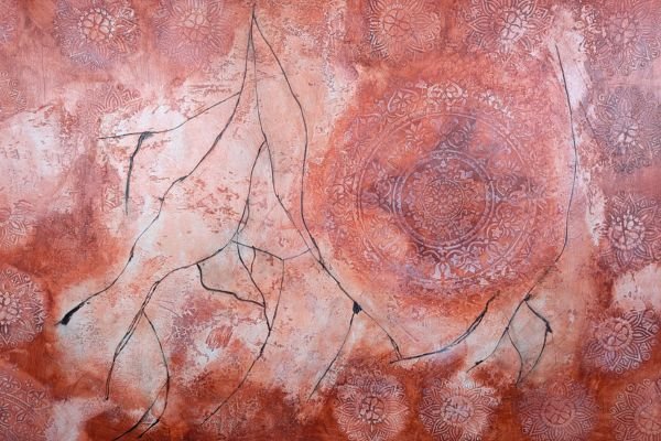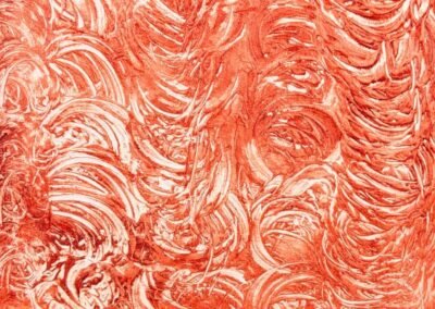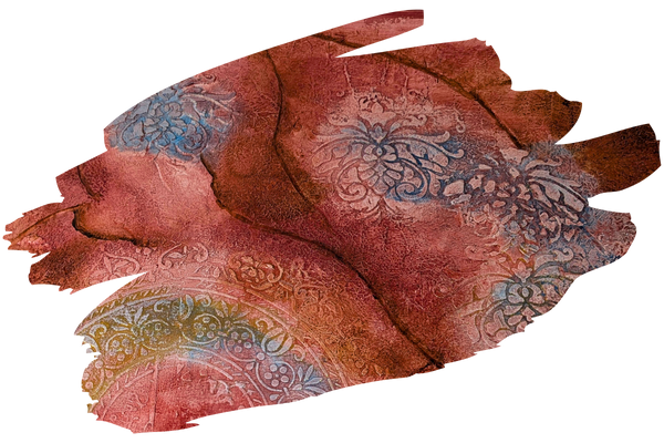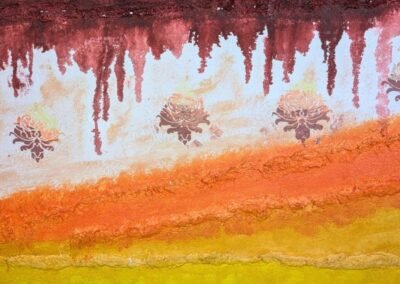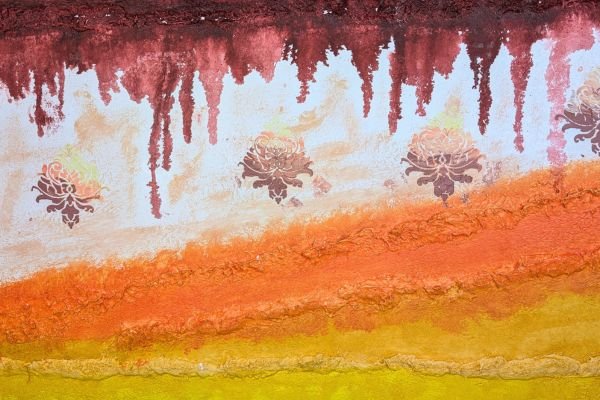 A bold and expressive decorative finish blending deep red, orange, and golden yellow tones in layered textures. The upper section features ornamental floral elements and dripping colour effects, adding a touch of artistic spontaneity. This design brings warmth, energy, and a unique personality to any space.