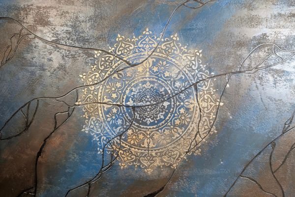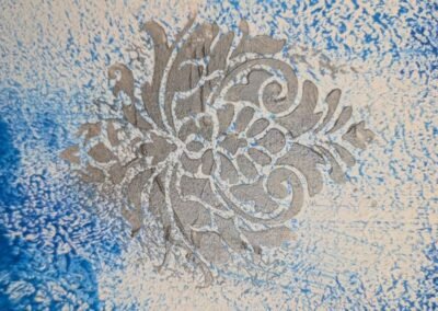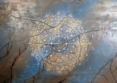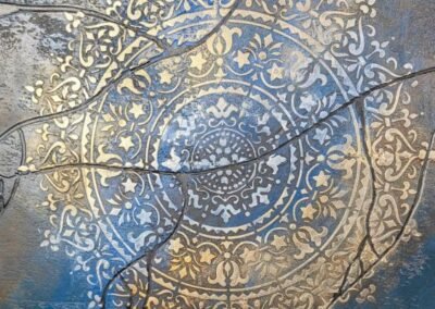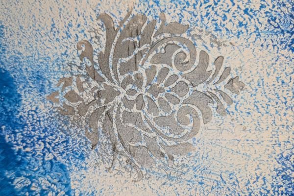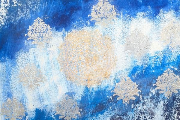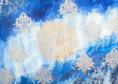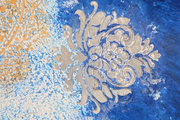A striking decorative finish featuring a rich blue background with an elegant silver ornamental motif. The textured surface and gradient tones create a vibrant, dynamic effect that adds both luxury and artistic flair to any space.