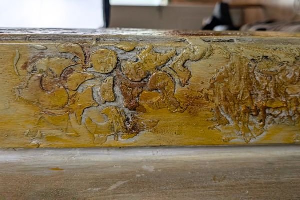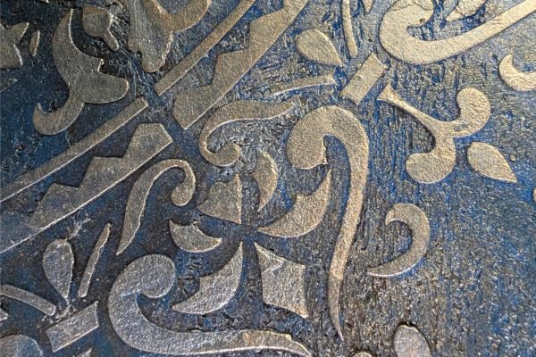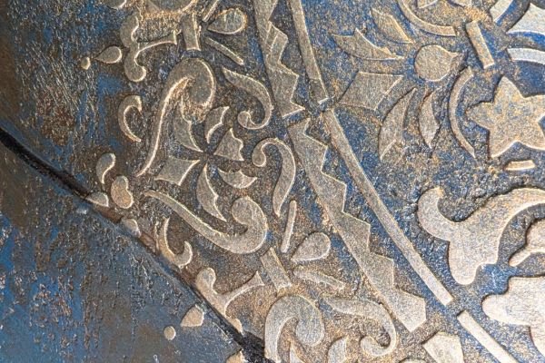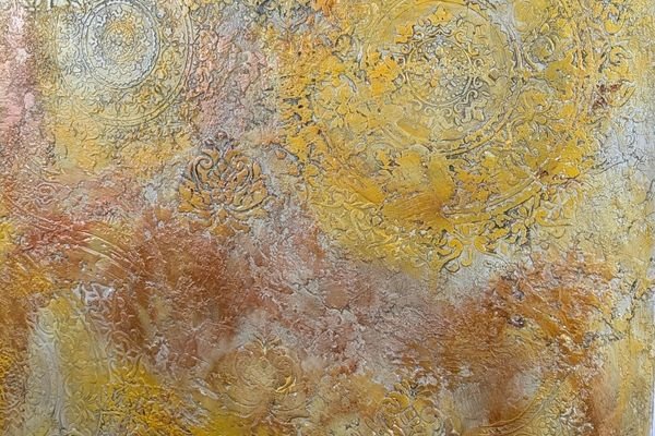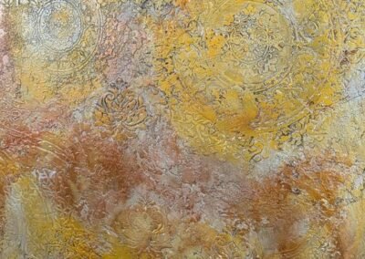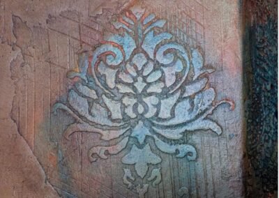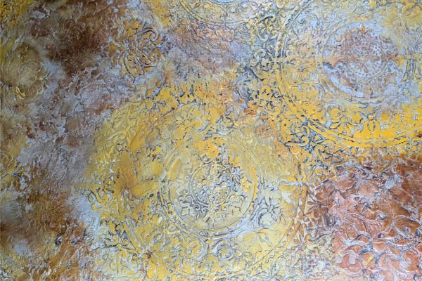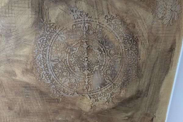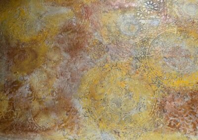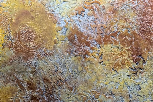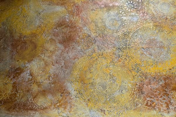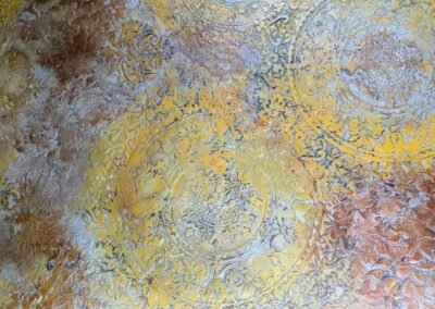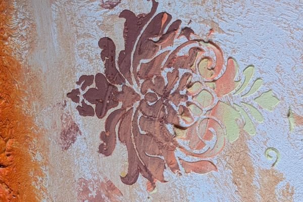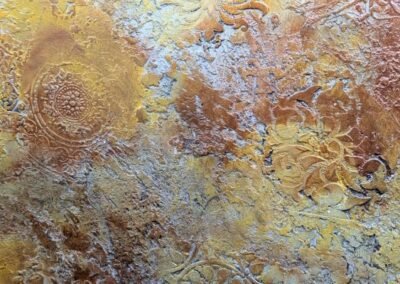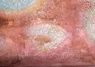 This luxurious wall finish showcases an intricate raised design created with detailed stencil work, offering both elegance and texture. Warm golden hues are blended with soft copper and subtle silvery accents, creating a rich, layered effect that suggests aged opulence. The ornamental patterns bring depth and sophistication to any space, making it an ideal choice for accent walls in elegant homes, stylish boutiques, or classical interiors that celebrate timeless beauty.