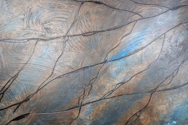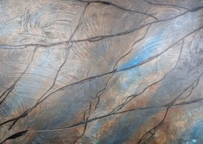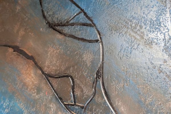 A striking wall decoration that blends contemporary artistry with tactile depth. This finish features abstract raised line patterns, reminiscent of flowing branches or veins, set against a textured backdrop of deep bronze and muted blue. The metallic shimmer catches the light beautifully, adding a dynamic, almost sculptural quality to the surface. Ideal for modern interiors, artistic spaces, or minimalist designs that call for bold yet refined visual interest.