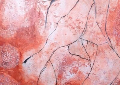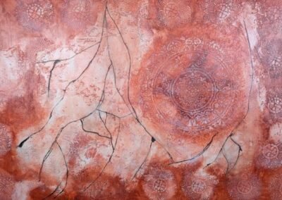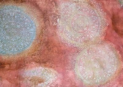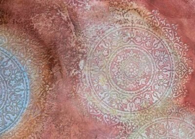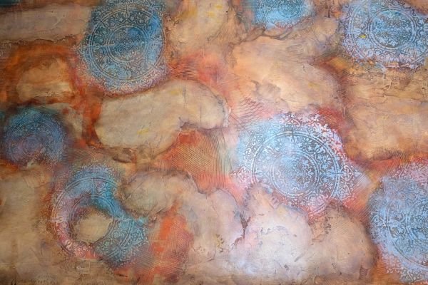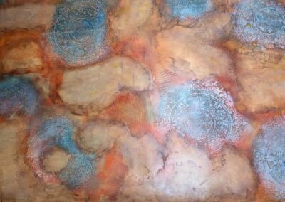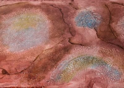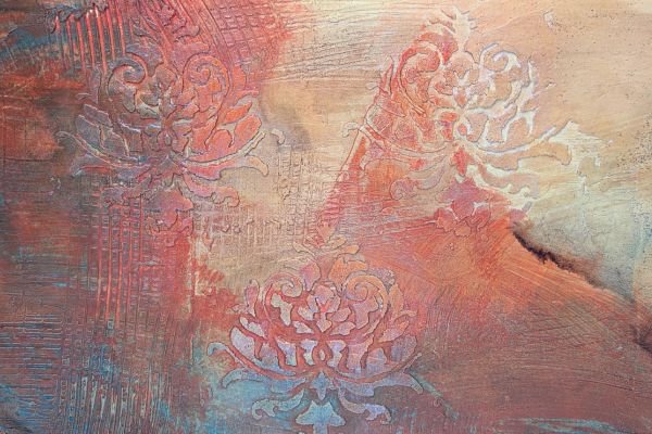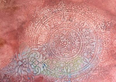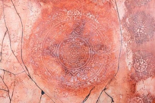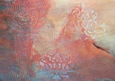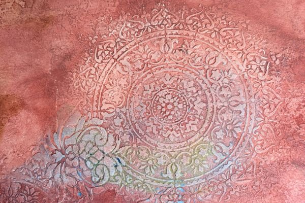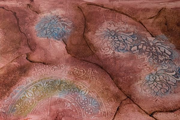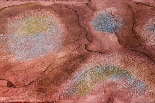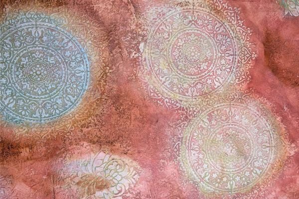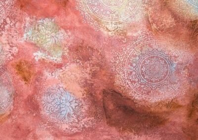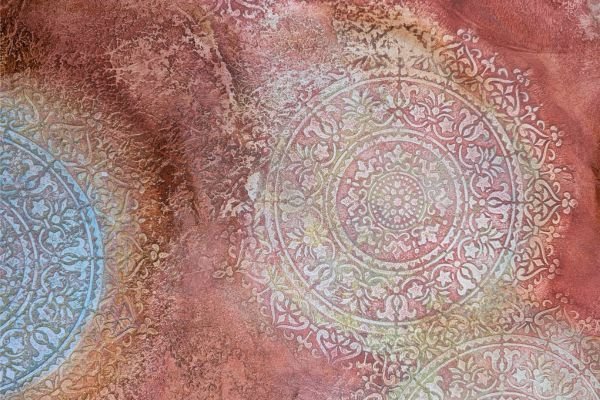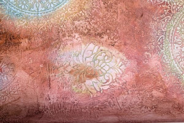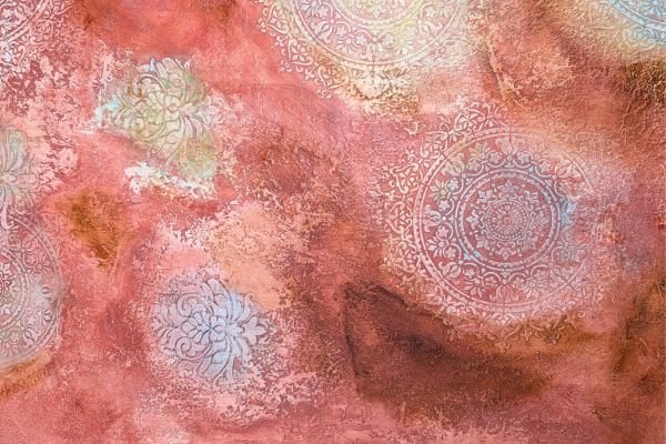 This warm-toned decorative finish features layered textures in rose, peach, and rust shades, enhanced by delicate circular floral medallions in soft pastel highlights. The overlapping elements create a dreamy, aged appearance with an artistic and sophisticated feel.
