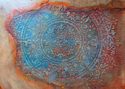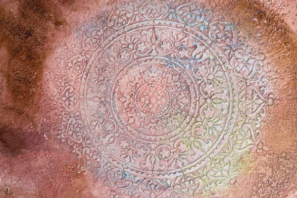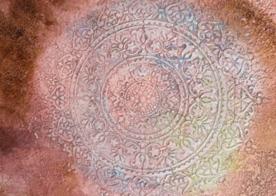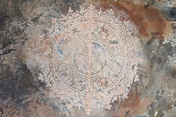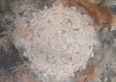 This elegant wall decoration features a large, intricate ornamental pattern with a soft, aged finish. The background blends earthy tones like grey, beige, and rust to create a rustic, time-worn effect that adds depth and character. The delicate circular motif brings a sense of harmony and timeless elegance to any interior.